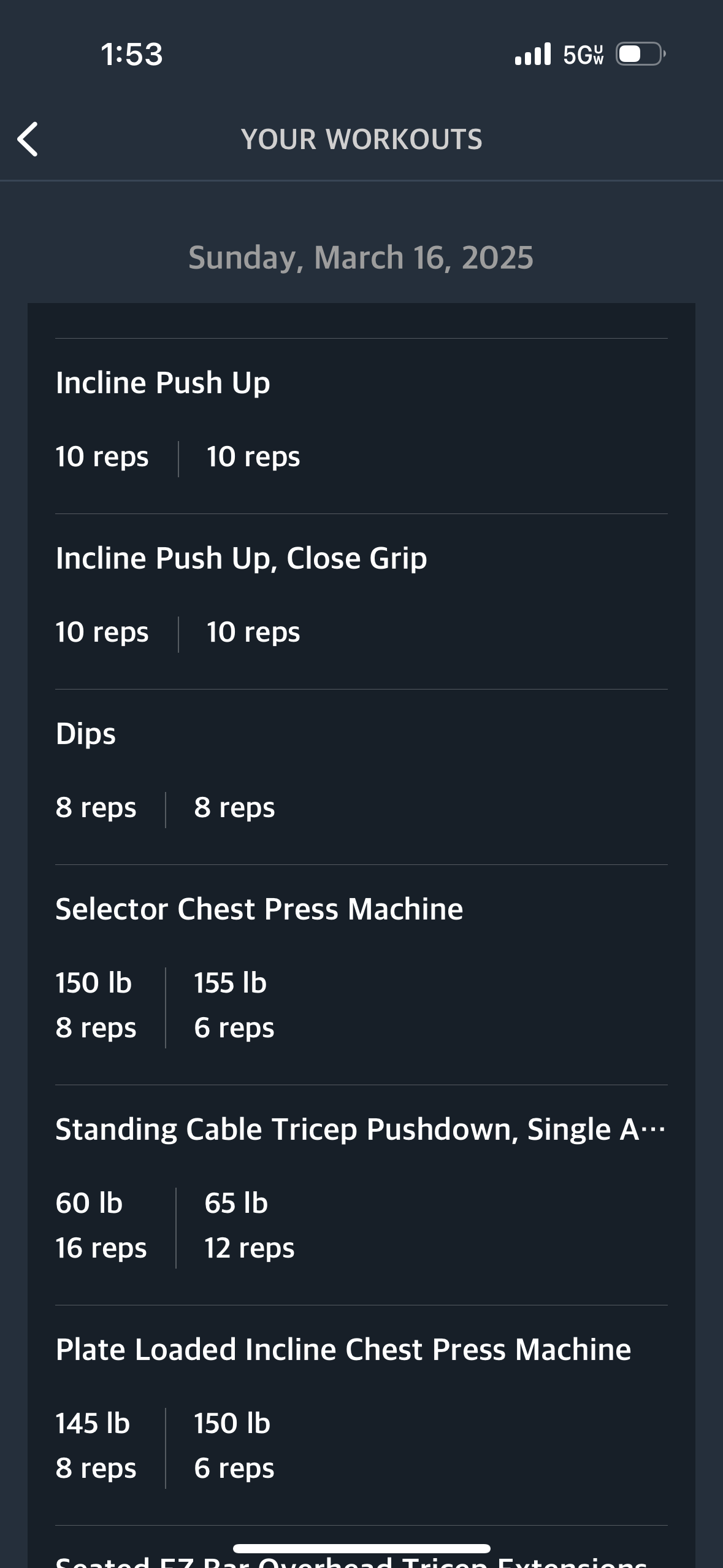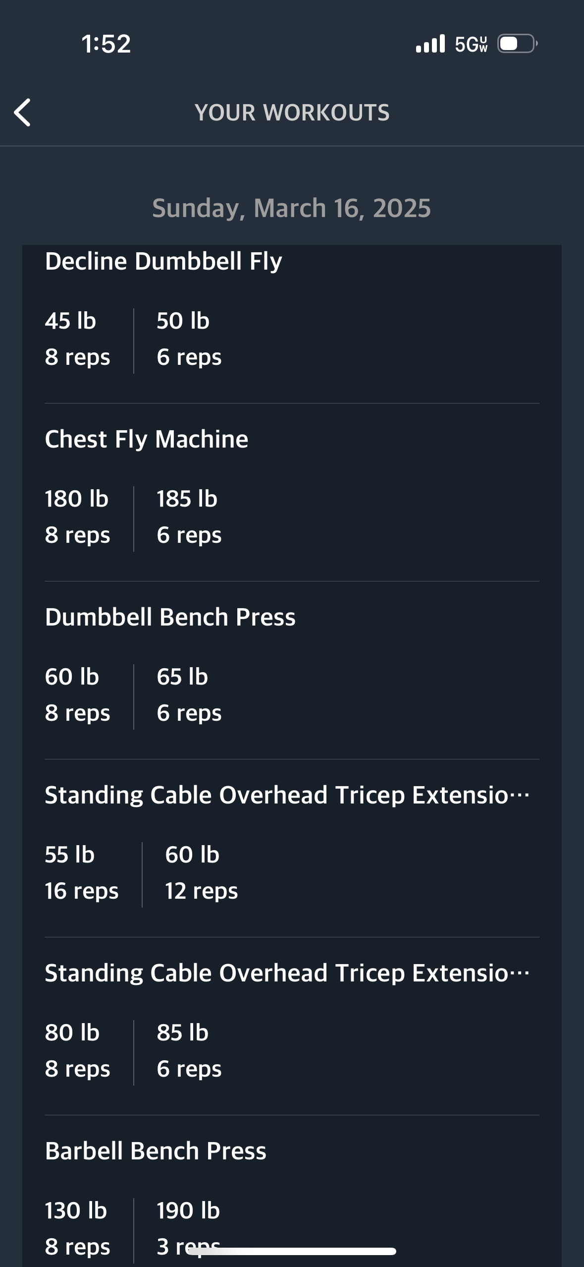Close Grip Smith Machine Bench: 185x12,205x10, 205x10, 135x to failure