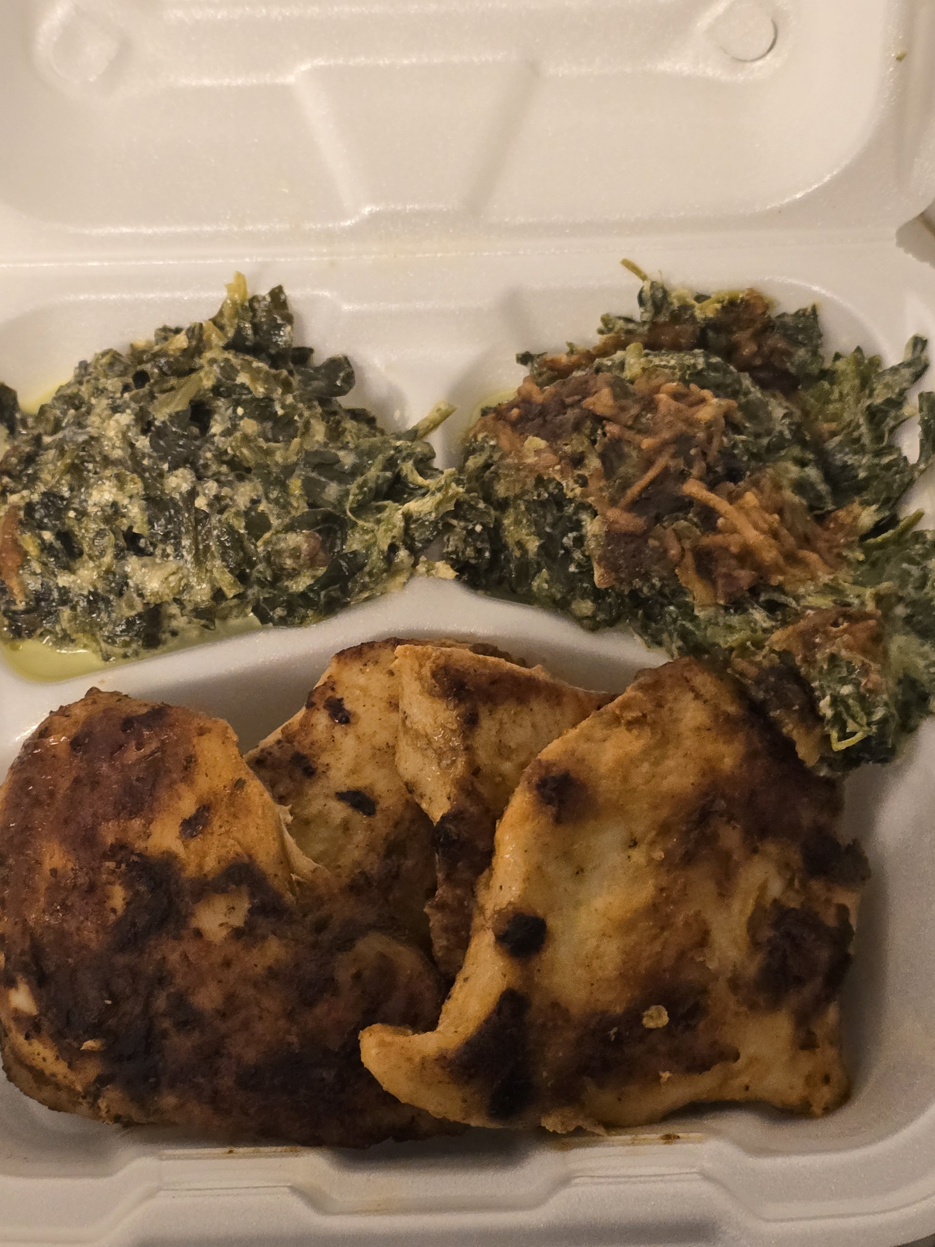 Today's dinner is chicken breast and creamy spinach.