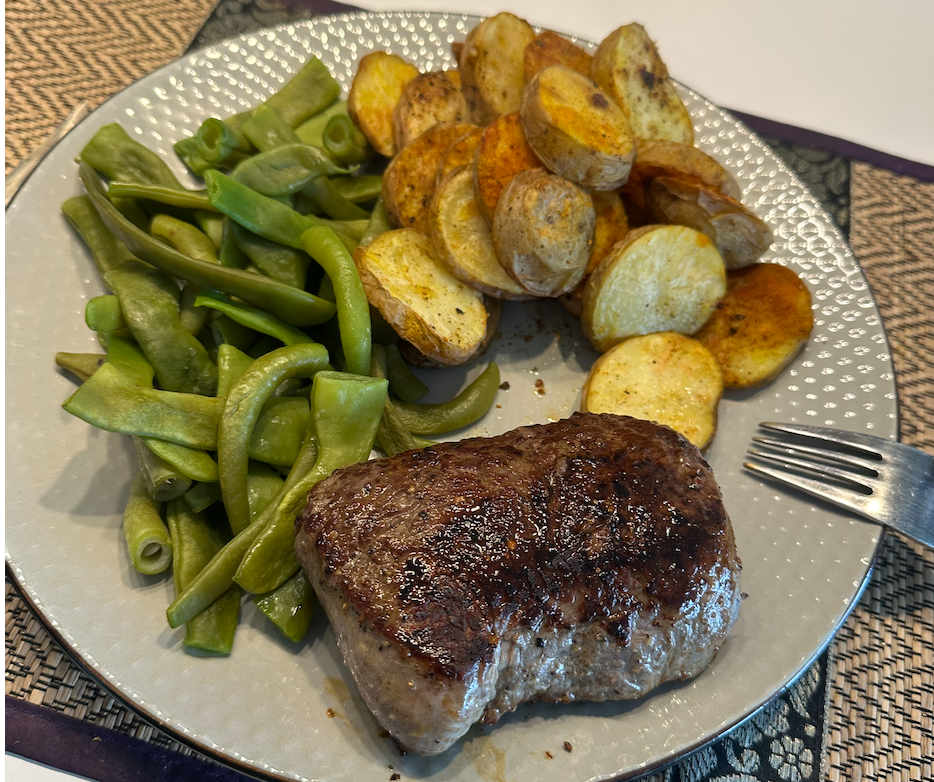 Lunch: 220 g horse filet from butcher nice read meat @BodyMonster34 , 300 g cooked potatoes, 150 g green vegetables, 15 g olive oil