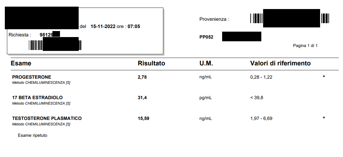 Phill V.I.P. Gold Nov 16, 2022 #1 Here bloodwork result. Cycle: 600 mg/week test (200 Tuesday, 200 Friday, 200 Sunday) 700 mg/week primo 20 mg/ED aromasin Blood was drawn on Tuesday morning, before the usual testosterone injection.