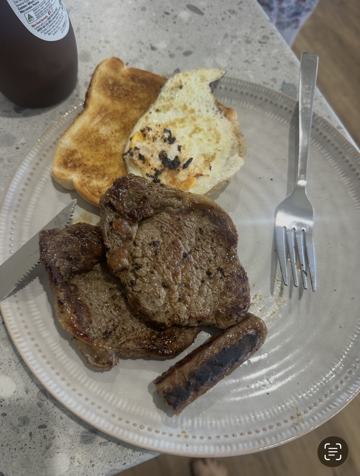 Meal #1 - 95g rib fillet steak, 1 egg, 1 sausage on hi fibre bread